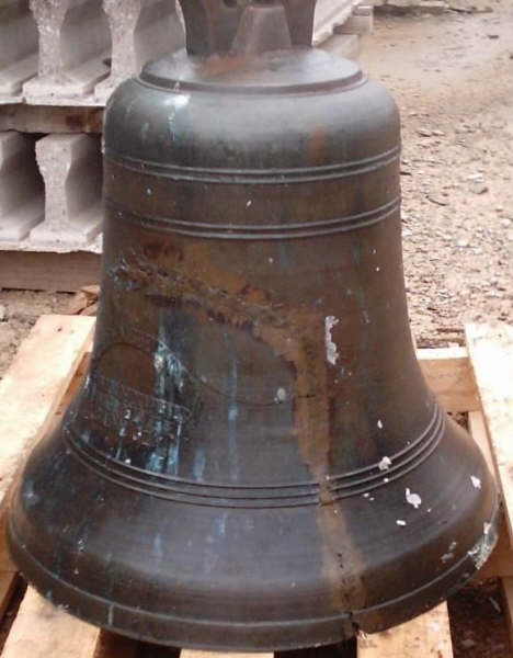 Ya tenemos la campana nueva, la primera foto, de Felix de la Cruz, podemos ver la grieta reparada con unos electrodos, sonaba fatal. En la Fundación Para el Fomento de la Innovación Industrial, Laboratorio de Siderurgia, y por mediación de Carlos de la Cruz se ha fundido y realizada nueva. Gracias por vuestra colaboración.